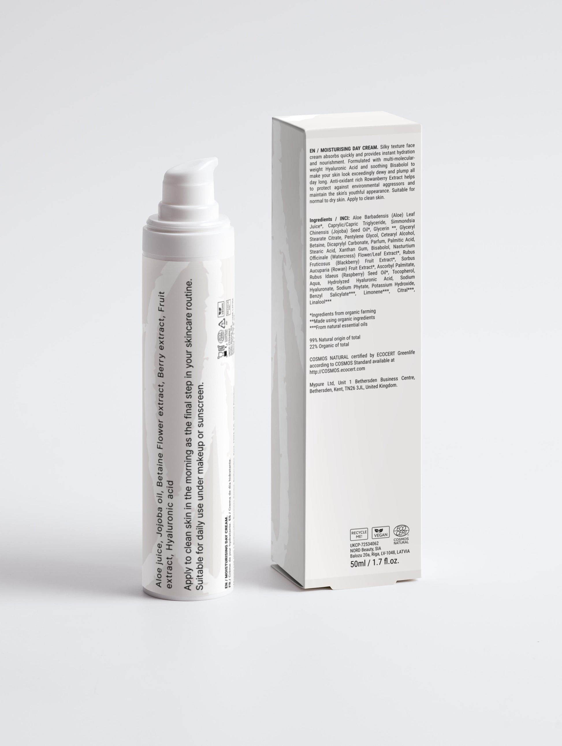 The Moisturising Day Cream delivers instant and long-lasting hydration in a silky, quick-absorbing formula. Powered by multi-molecular Hyaluronic Acid, it locks in moisture at multiple skin levels for a plump, dewy look that lasts all day. Bisabolol soothes and calms, while antioxidant-rich Rowanberry Extract, along with organic Blackberry and Raspberry oils, help defend against environmental stressors that contribute to premature ageing.